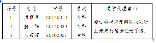 根据beat365唯一官方网站beat365唯一官方网站《关于成人高等教育学生学籍管理规定(修订)》第九条、三十一条相关规定,经学校研究决定,给予唐雷雷等3名学生退学处理。具体名单及处理事由如下: