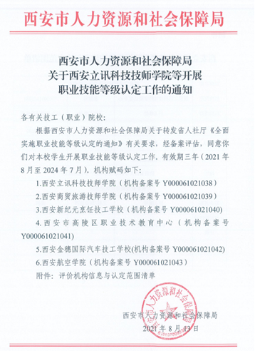 为满足学生职业技能认定的需求,经与西安市职业技能鉴定指导中心沟通、协调后,beat365官网申请开展职业技能等级认定备案工作。 职业技能等级认定是指经人社部门备案的评价机构,依据国家职业技能标准或职业技能评价规范,对劳动者技能水平进行评价并核发职业技能等级证书的一项工作。
